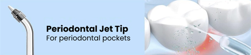 • The nozzle with a fine white tip is best suited for targeting periodontal pockets and cleaning along the gumline. For optimal use, position it slightly beneath the gumline or into the pockets, using a low-pressure setting.